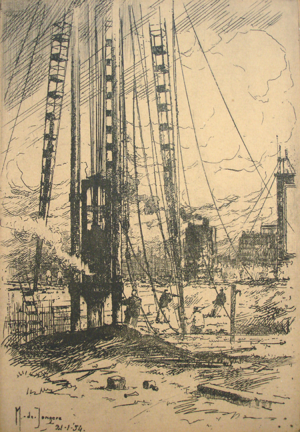 Op deze ets, die Marius De Jongere in 1954 maakte voor een menukaart voor de Vrijmetselarij, zijn duidelijk de symbolen van deze broederschap te herkennen.