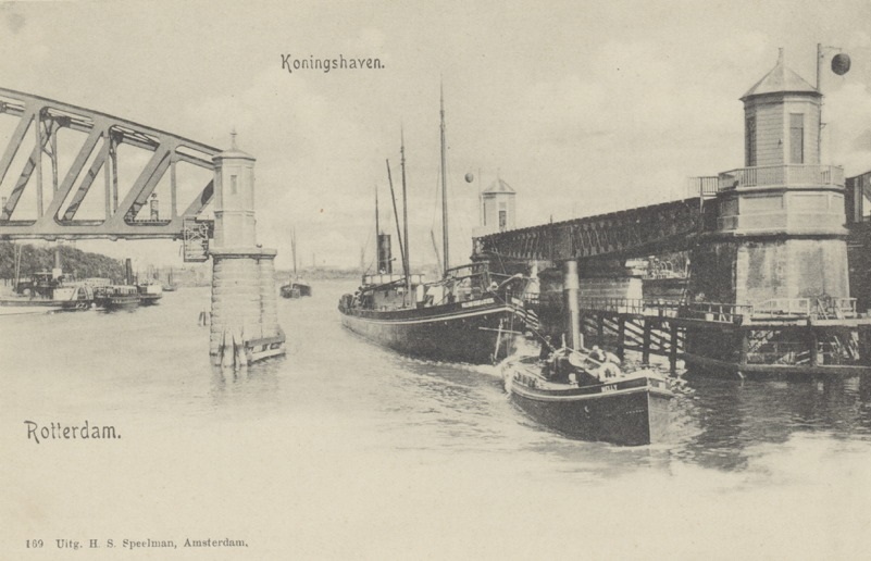 Rotterdam 1890, de Koningshaven met een N.A.S.M. stoomschip en Poortgebouw. Olieverf op doek. Doekmaat 52,7 x 65 cm. In goede conditie. Herkomst; Particuliere collectie Utrecht. Prijs op aanvraag, 0628381883