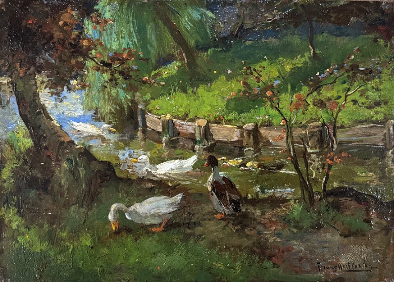 Eenden langs de waterkant. Olieverf op paneel. Paneelmaat 26 x 36 cm. In originele lijst en ongerestaureerd. Herkomst; Particuliere collectie Rotterdam. Prijs op aanvraag, 0628381883